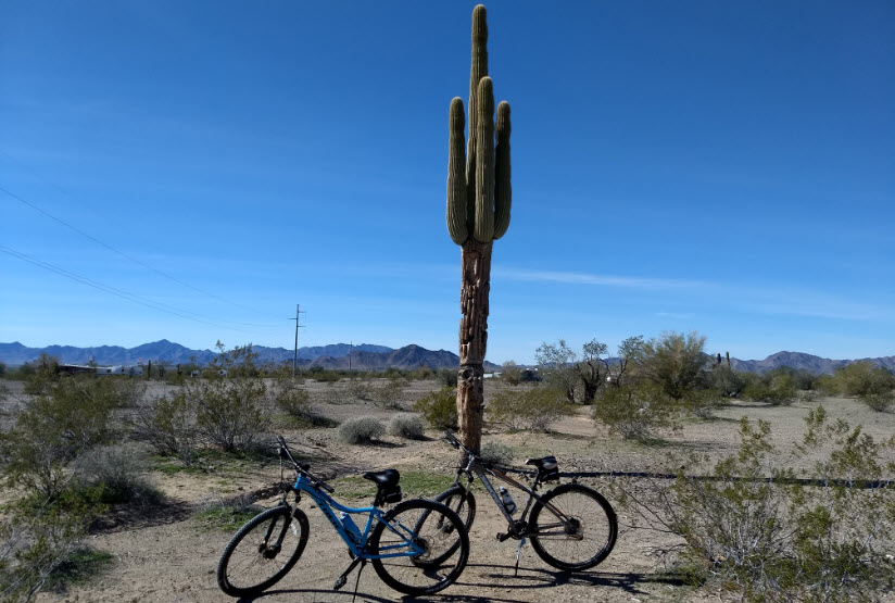 Quartzsite is not exactly chock full of things to do. Most people come to the area in an attempt to save money on travel expenses and take in the Big Tent Show. We took the time to perform some RV maintenance (More on that in a later blog post) and do some mountain biking. Check out this huge cactus just outside the Scadden Wash area. We were suprprised it was still standing due to the number of holes in its trunk.