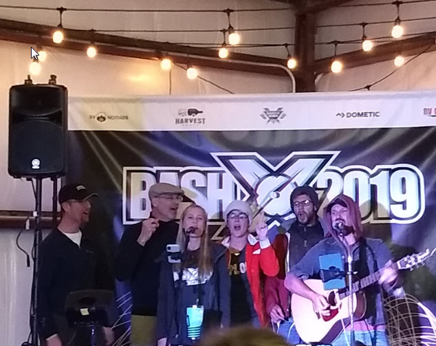 After the Margarita Throwdown, we were treated to a musical performance by Kyle and Olivia of Drivin’ and Vibin’. This is the second time we’ve seen them perform and they are wonderful. At the end of the set, Kyle and Olivia brought up Tom and Cait Morton from Mortons on the Move, and Peter and John from RVgeeks.