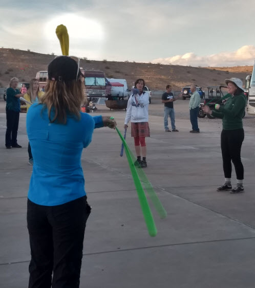 I also happened to capture an action picture of Becky Schade of Interstellar Orchard and Kelly Beasley, co-founder of the website CampAddict spinning Poi.